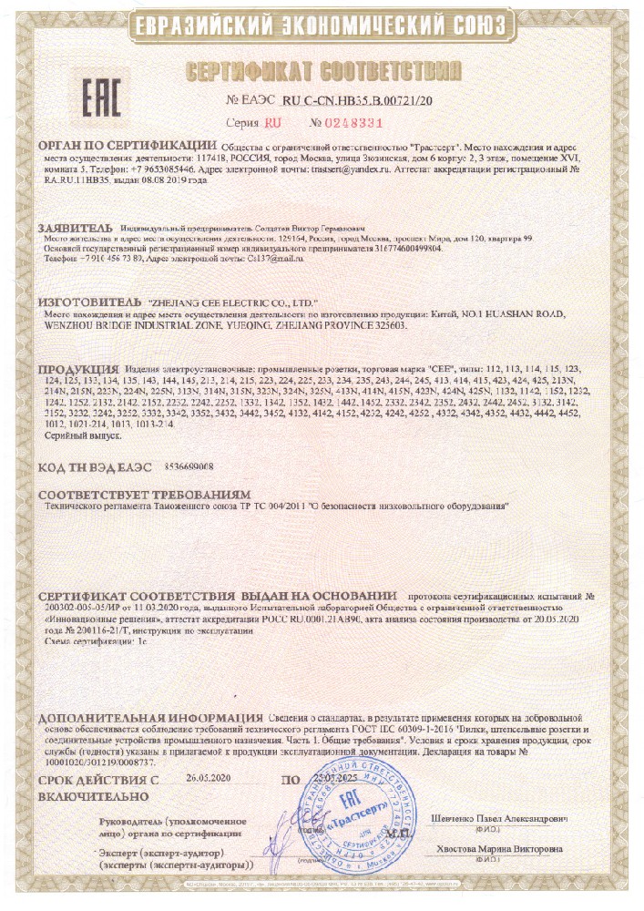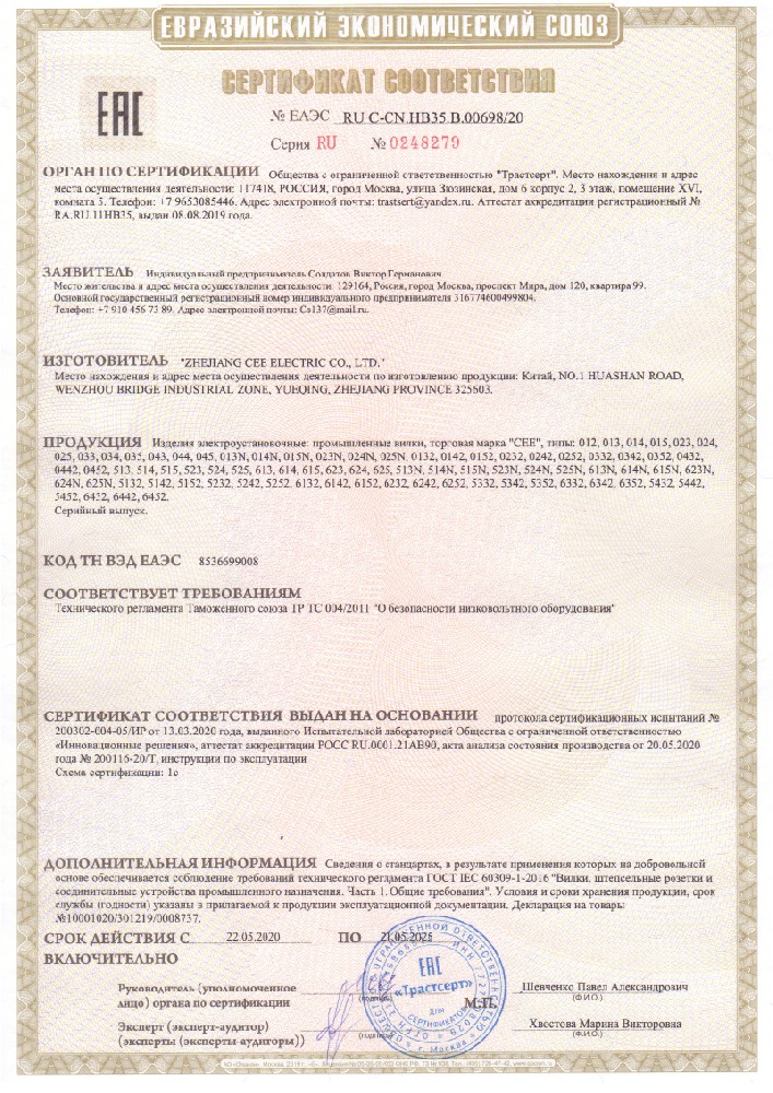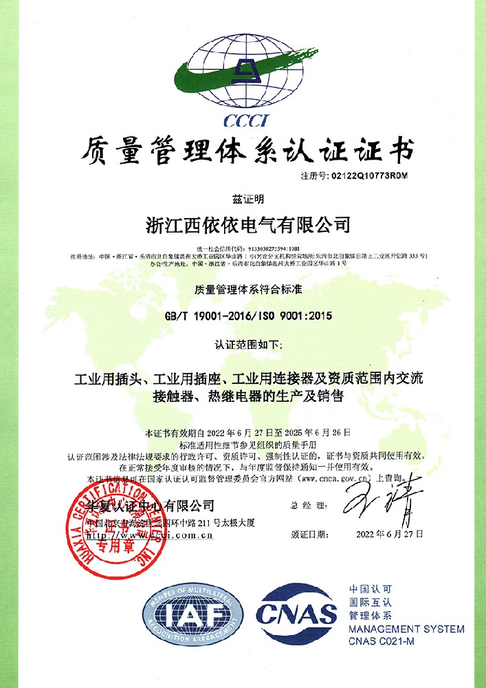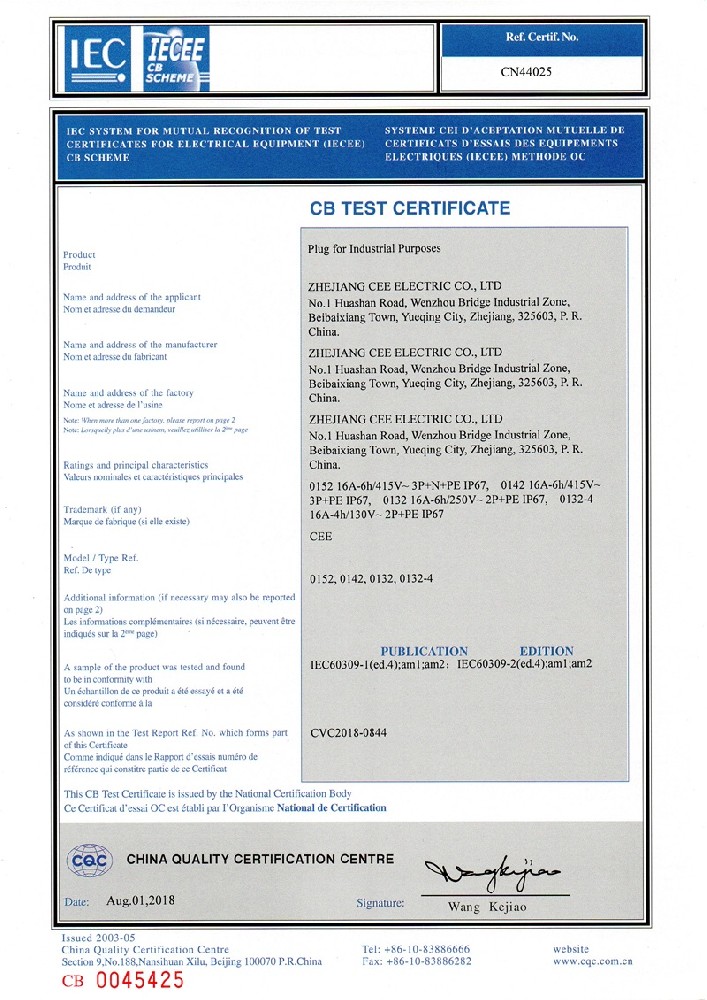 公司全面貫徹實施IS09001:2015質量管理體系認證。工業插頭插座符合IEC 603 09-1-2, EN 60 309-1-2國際標準, 組合插座箱符合EN61439標準,并通過Intertek & TUV Rheinland & CQC等認證。證書包括TUV、SEMKO、CE、CB、EAC,并符合RoHS和Reach等適用法規。公司引進先進生產設備和精密檢測試驗儀器、不斷引入高科技工藝流程和技術人才,為公司的產品研發、質量升級、管理創新提供了強有力的保障。公司將持續以優質的產品和服務,贏得客戶的最大滿意為宗旨,發揚“創新、服務、溝通”的企業精神,力促CEE品牌從中國走向世界。我們牢牢把握時代賦予的使命和機遇,與海內外合作伙伴共同開創事業的新高度。